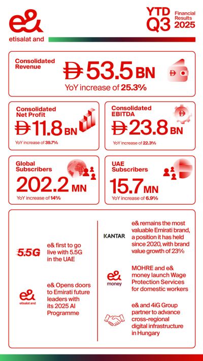 阿聯酋阿布扎比2025年10月30日 /美通社/ — e& 公佈 2025 年第 3 季度合併財務報表,報告顯示合併營業額為 186 億迪拉姆,較去年同期增長 29.2%。同時,2025 年首九個月的合併營業額為 535 億迪拉姆,較去年同期增長 25.3%。這反映該集團穩健商業模式,以及延續上半年破紀錄業績的能力。